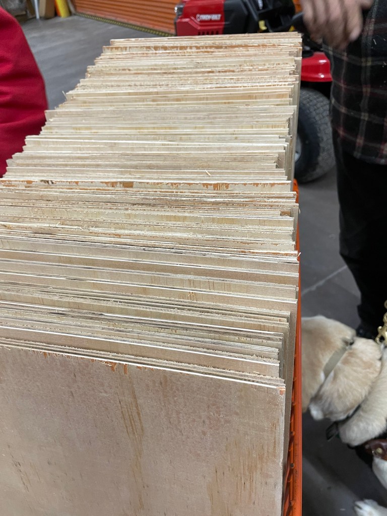 I went to a big box lumber store while I was in PA and filled my trunk with this 1/8thā birch plywood cut to size! Thanks to my good friends Joe & Lisa who helped me load this wood, transport it, and reload it into my smaller car!! This will give me a good start at creating jigs, material test grids, and my first layered projects like: